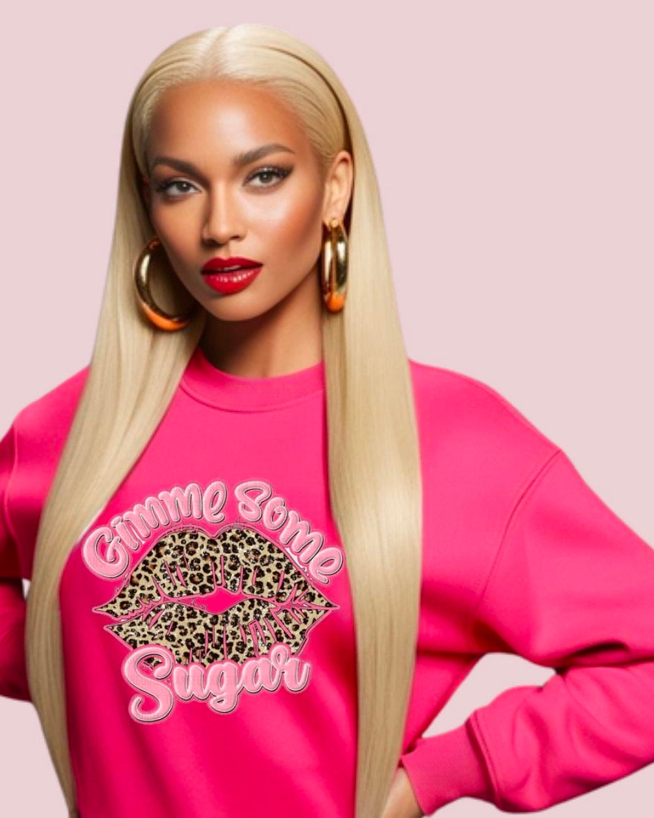 - Bright and bold pink sweatshirt with “Gimme Some Sugar” text