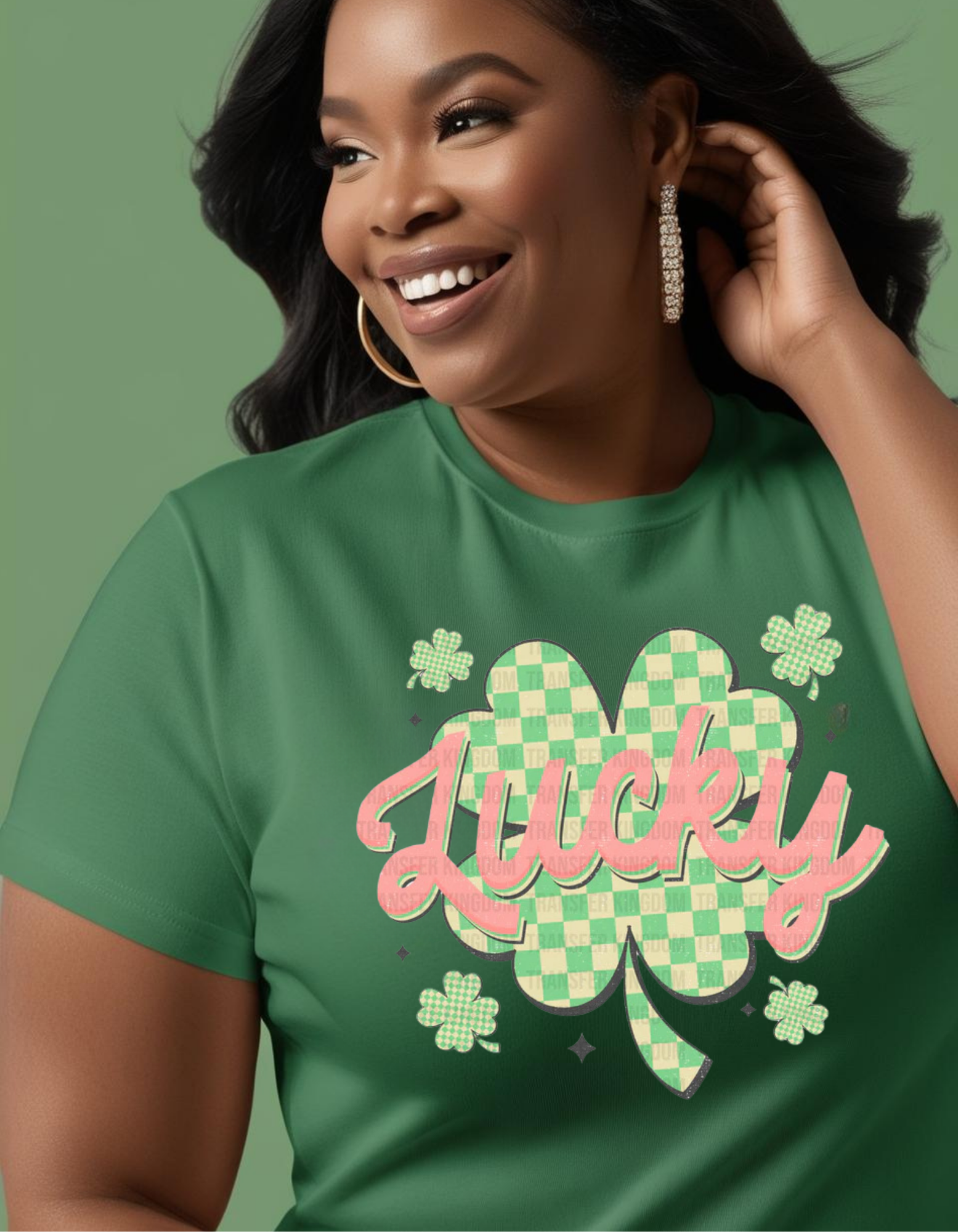 - Design: Bold "Lucky" lettering in a pink & Green plaid pattern, often accented with shamrocks, glitter details, or lucky charms for extra festive flair.