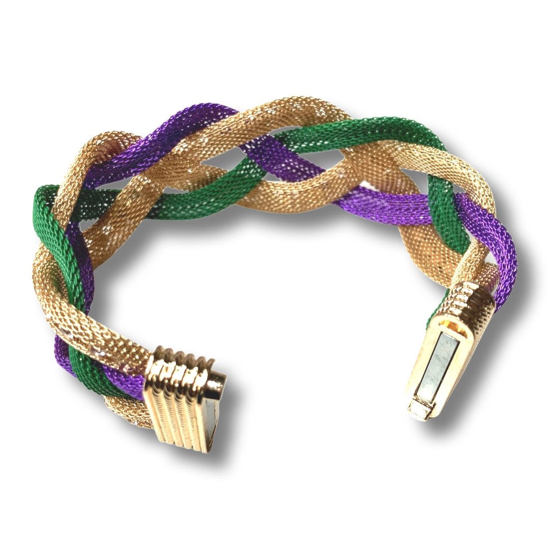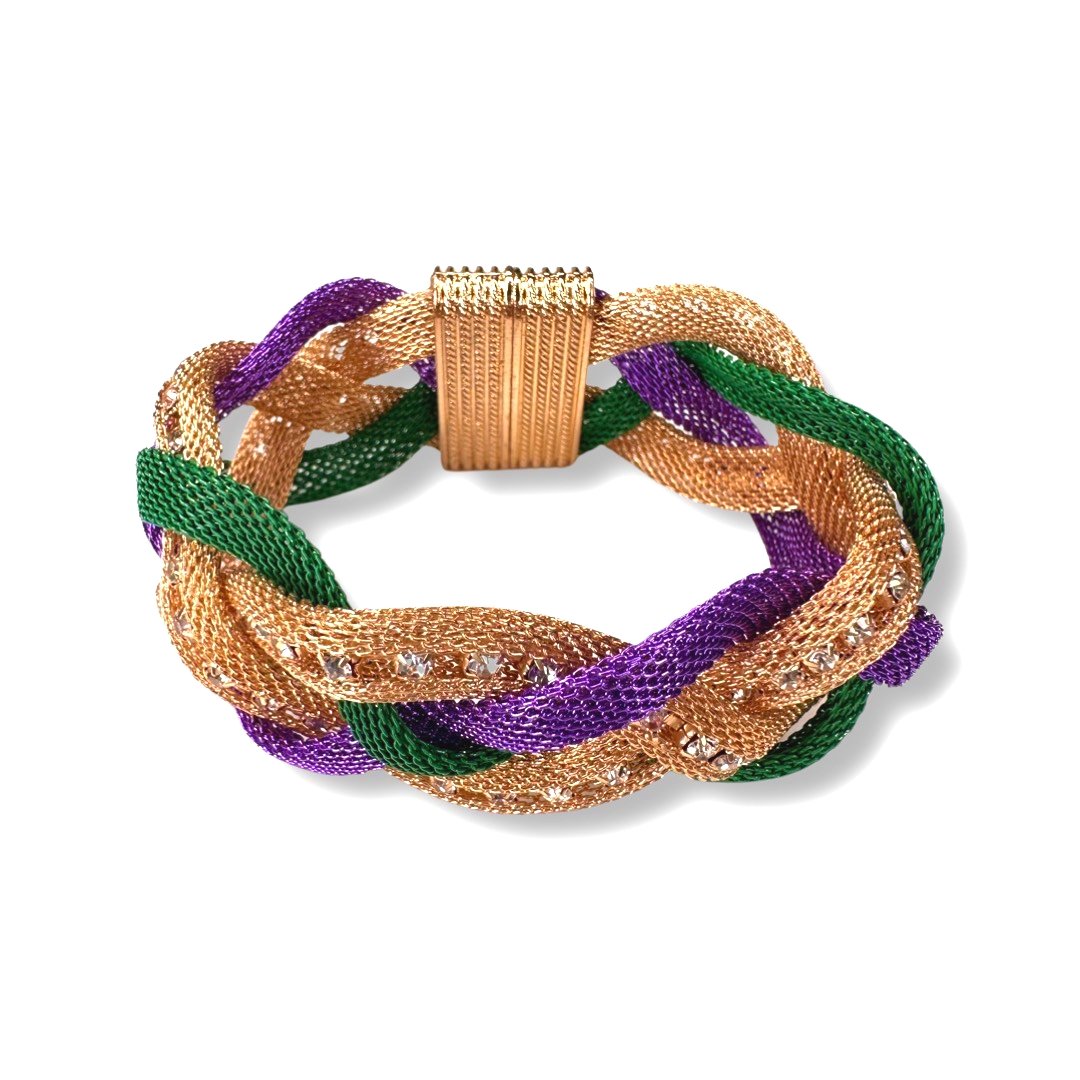 Stylish Mardi Gras Magnetic Spiral Braided Bracelet in metallic purple, green and gold. This is the perfect accessory for all of your Mardi Gras festivities